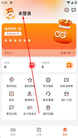 2、在我的页面中,找到并点击上方的未登录区域。