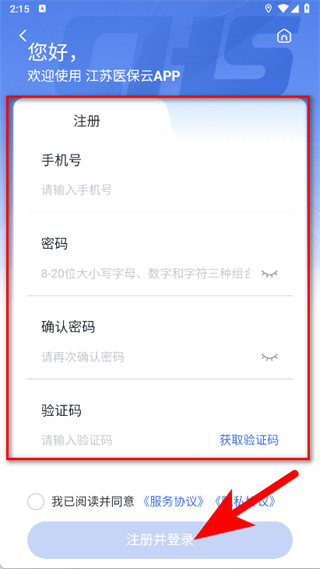 4、依次输入手机号,获取并输入验证码等信息,勾选同意相关协议后,点击注册并登录,完成注册。