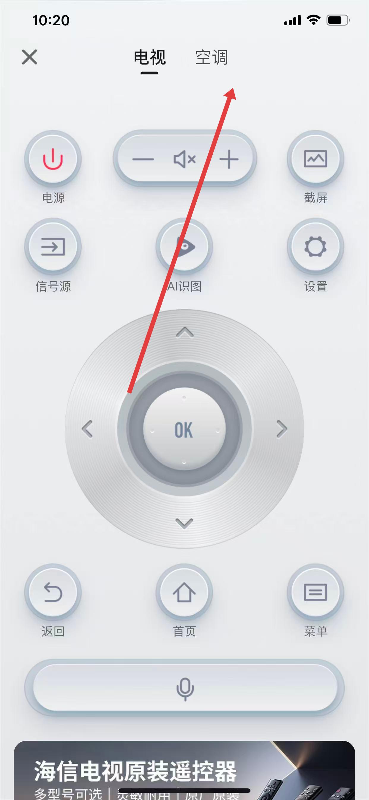 1. 打开海信爱家App,点击底部导航栏中间类似遥控器的图标。