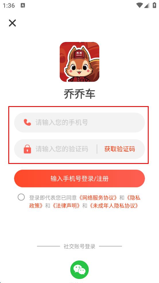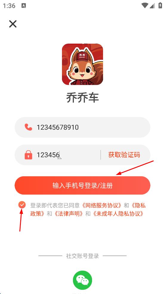 4、勾选同意协议隐私协议,然后点击“输入手机号登录/注册”按钮。