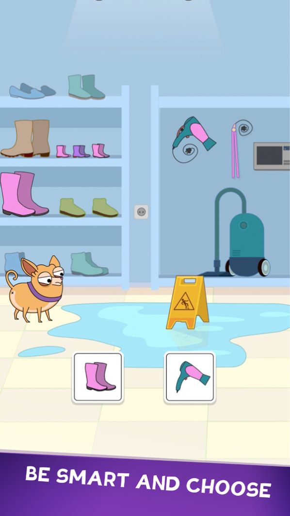 2、你需要根据每一个关卡中的情况来选择正确的道具,帮助吉娃娃克服困难。道具系统设计巧妙,不同道具组合能产生意想不到的效果,考验玩家的观察力和逻辑思维能力。