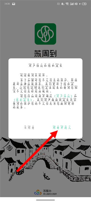 1、打开苏周到APP,在弹窗中点击同意并进入。