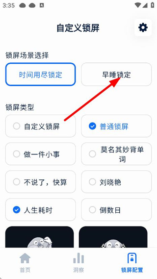 2、在自定义锁屏页面,锁屏场景选择可点击早睡锁定。