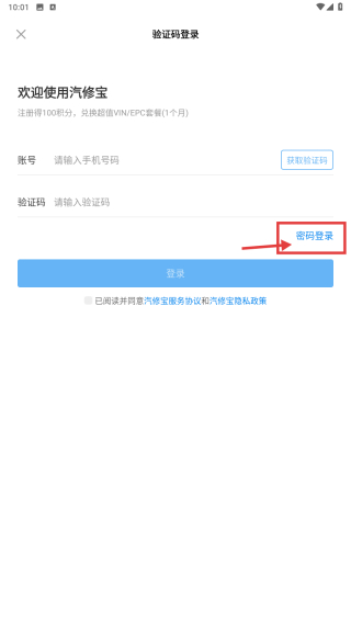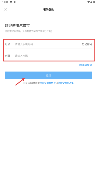 4、在密码登录页面,输入手机号码和密码后勾选已阅读并同意汽修宝服务协议和汽修宝隐私政策,完成账号登录操作。