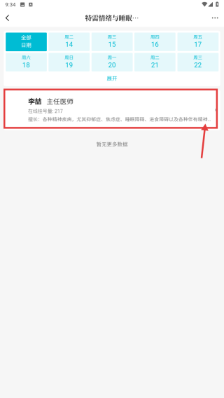 4、在门诊详情页,查看李菡主任医师的挂号信息,其擅长睡眠、各种情绪障碍,在线挂号费217元。