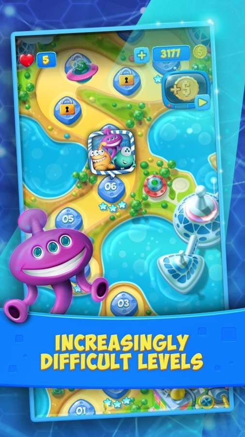 3、有着Snappy审美和声频,也有外星生物,持续提高三维消消乐技巧;游戏内设有技巧学院模式,由可爱的外星导师教授高级技巧,通过完成特训还能解锁限定皮肤和成就称号。