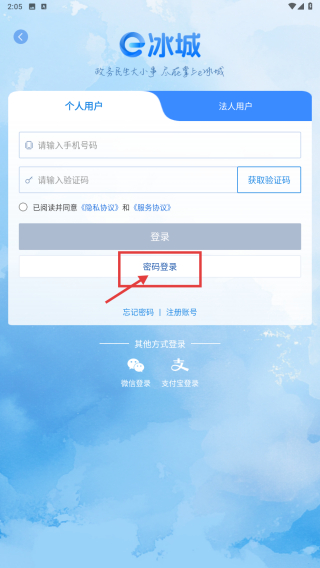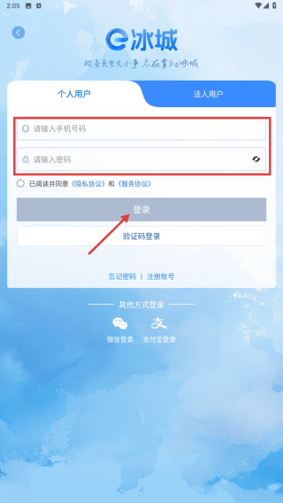 4、输入手机号码和密码,勾选隐私协议和服务协议后,点击登录按钮,完成账号登录。