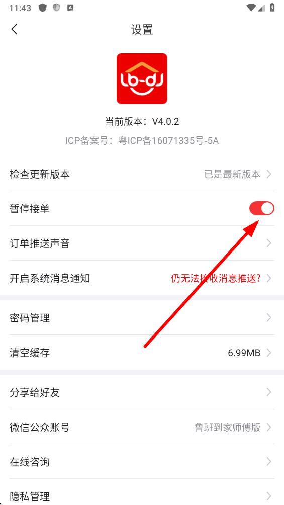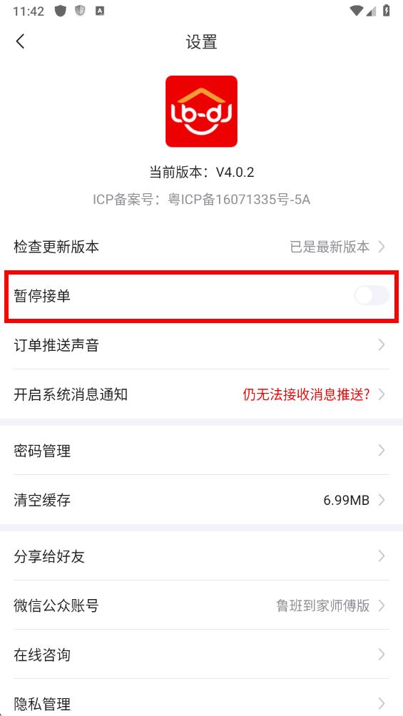 4、点击暂停接单选项右侧的开关按钮,将其切换至开启状态,即可暂停接单。