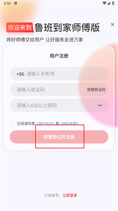 4、输入手机号以及验证码等即可进行账号的注册,点击【同意协议并注册】按钮即可。