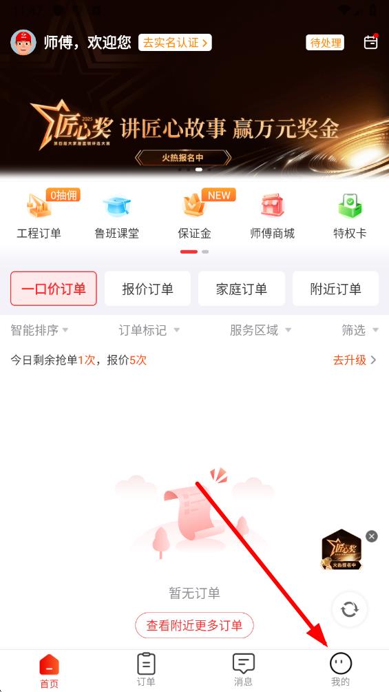1、打开鲁班到家app,点击底部导航栏中的我的图标进入个人界面。