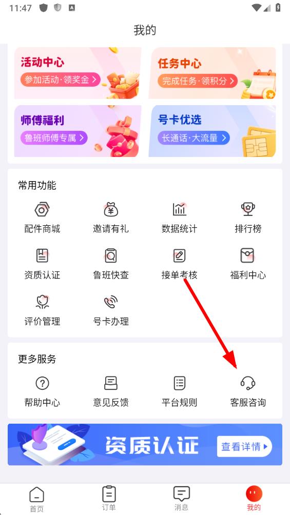 2、在个人界面的更多服务板块中,找到并点击客服咨询选项。