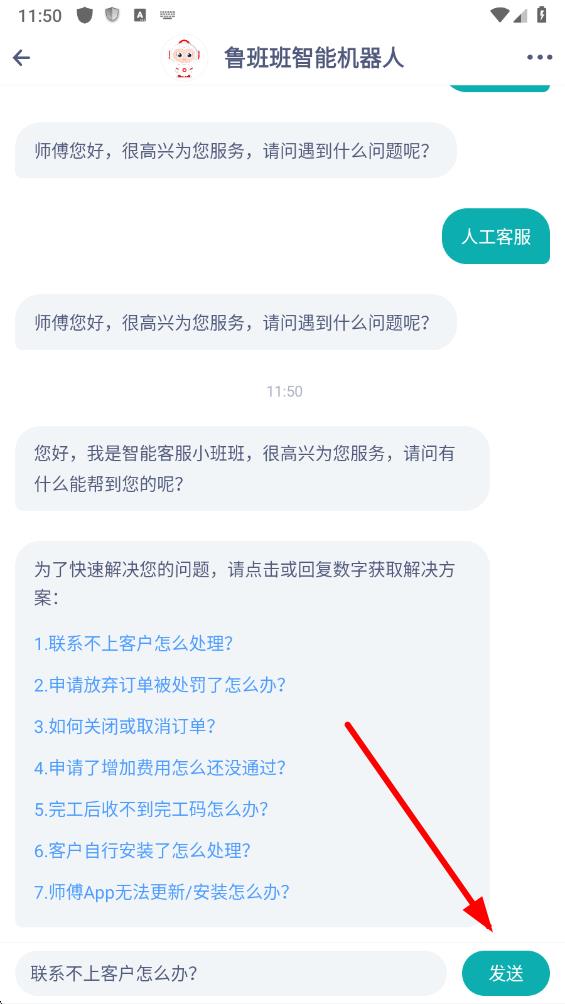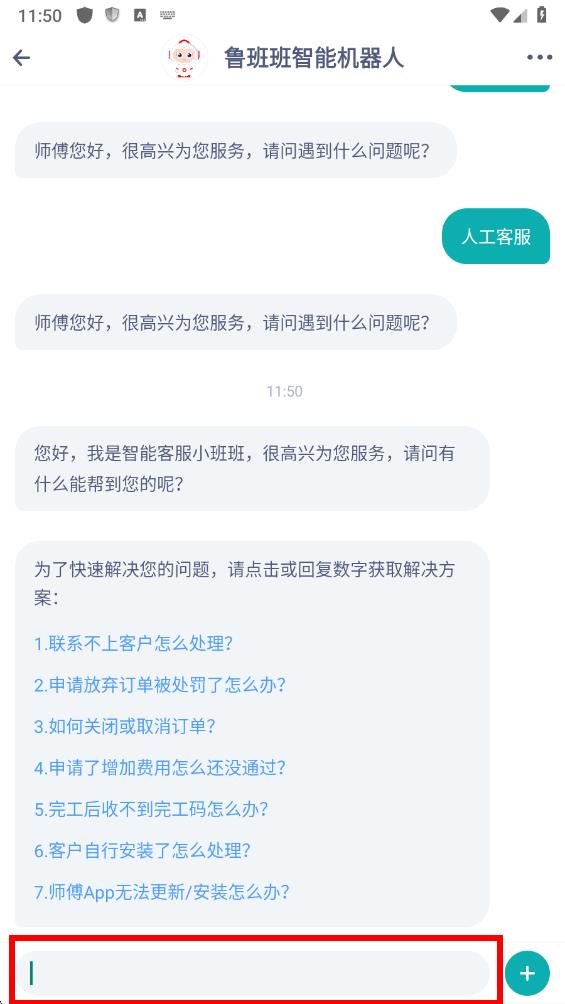 3、进入与鲁班班智能机器人对话界面后,在下方输入框中输入你遇到的问题。