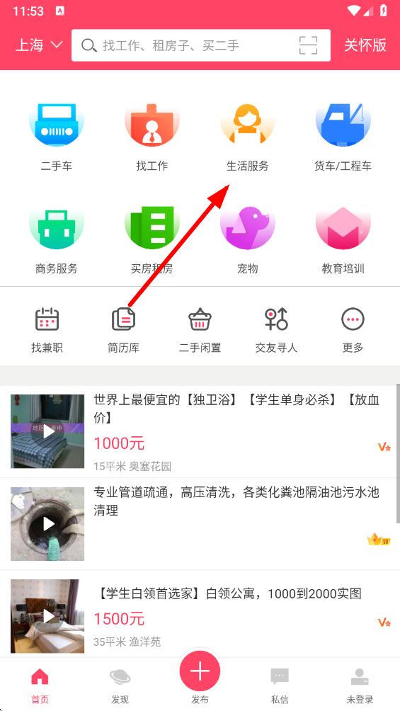 1、打开百姓网APP后,在首页众多功能图标中,找到并点击生活服务选项,进入生活服务相关界面。