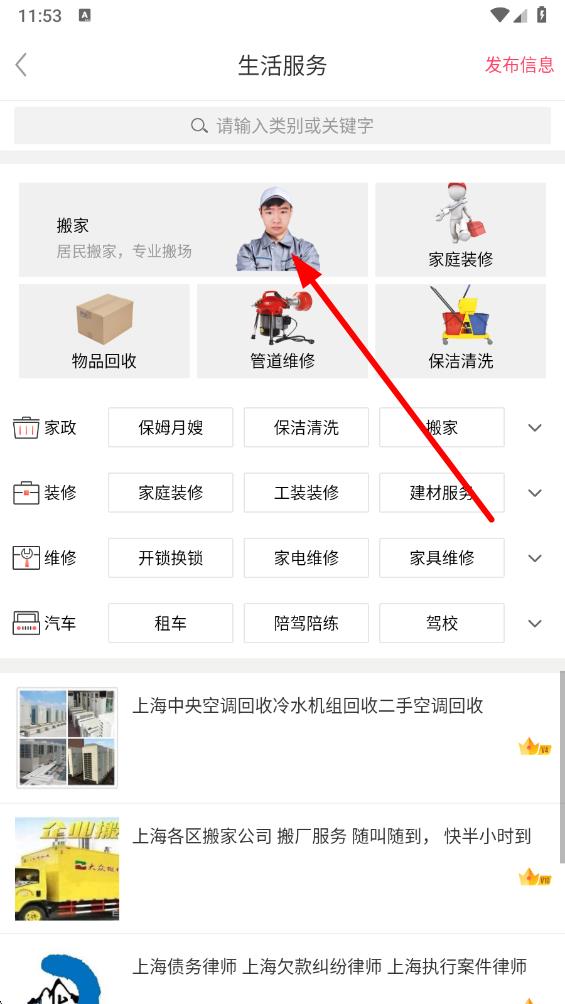 2、进入生活服务界面后,在众多服务类别中,点击搬家图标,进入搬家服务页面。