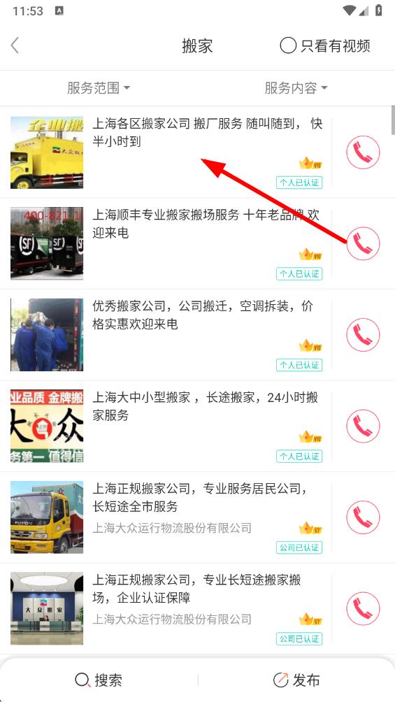 3、在搬家服务信息页面,浏览各个搬家公司信息,选择一家你认为合适的搬家公司,点击其对应的服务条目。