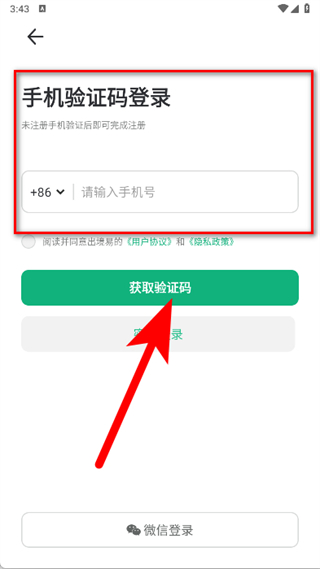 3、在手机验证码登录页面,输入手机号后,点击获取验证码。