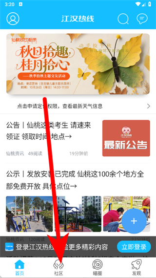 1、打开江汉热线,点击底部社区。