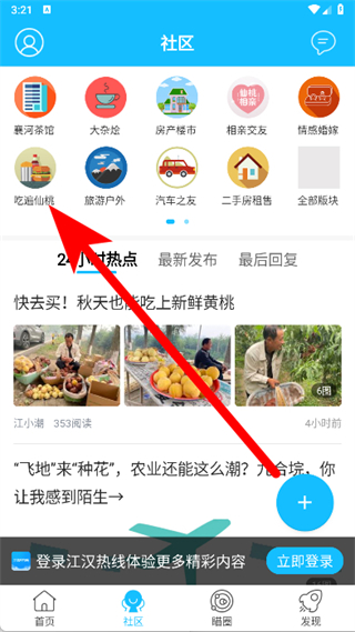 2、在社区页面,点击吃遍仙桃板块。