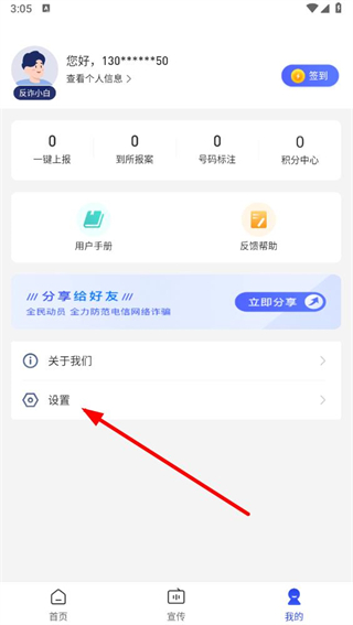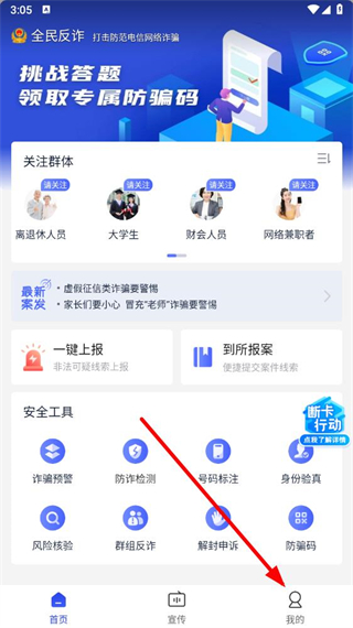 1、打开全民反诈app,点击底部导航栏中的我的选项。