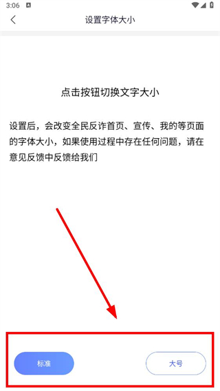 4、在设置字体大小页面,可根据需求点击标准或大号按钮,切换文字大小。
