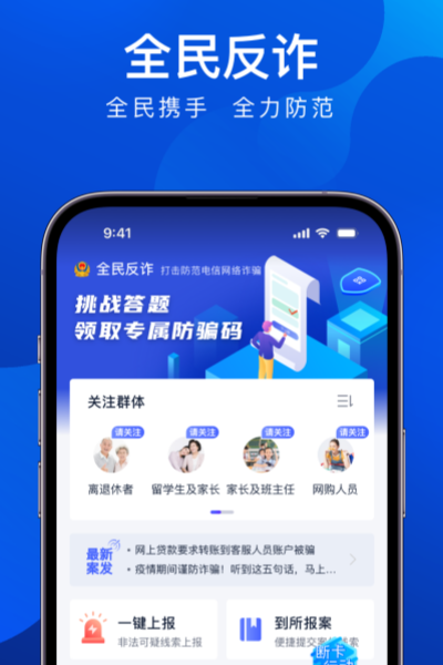 全民反诈app是公安部主导开发的专业反诈工具,以官方权威和智能防护为核心,为用户筑牢财产安全防线,操作简单且实用性极强,开启预警后,能实时识别拦截涉诈电话、短信及可疑APP,提前规避风险,遇可疑信息可一键举报,为警方打击诈骗提供线索,平台还常态化推送反诈知识,提升防骗意识。