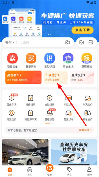 1、打开车三百app,在首页点击车辆估价选项,进入车辆估价页面。