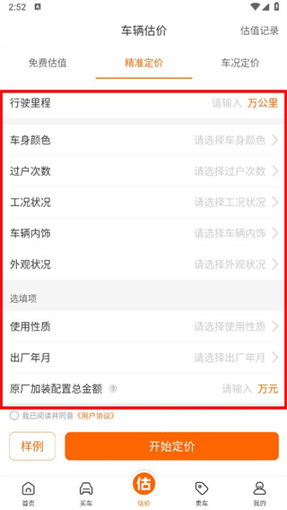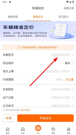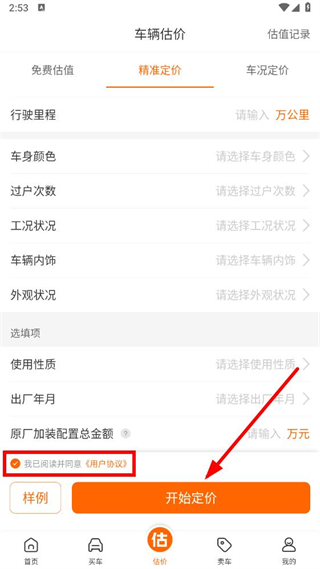 4、勾选我已阅读并同意用户协议,点击开始定价按钮,即可完成车价评估操作。