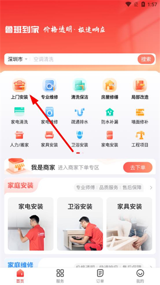 1、打开鲁班到家app,在首页按照个人需求,点击上门安装选项,进入服务选择界面。