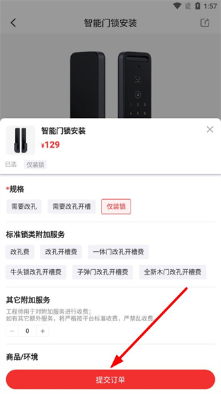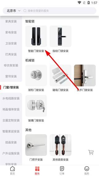 2、在服务选择界面,按照个人需求点击智能门锁安装选项,进入服务详情页面。