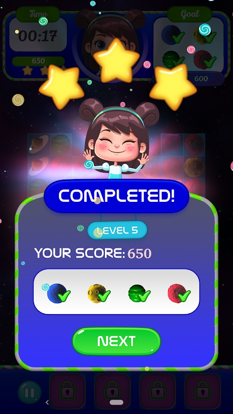 3、玩家可以在游戏当中通过不断完成连消的过程,释放来自生活当中的压力。特别设计的"减压模式"中,消除会触发夸张的爆炸效果和治愈的ASMR音效,还有可爱的外星生物会为玩家的连击欢呼喝彩。