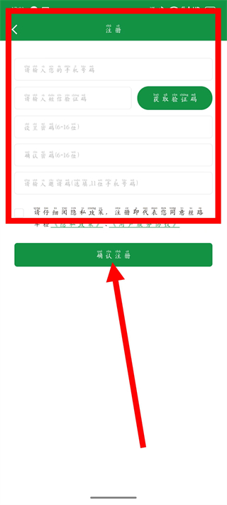 4、依次输入手机号码、短信验证码、设置密码,确认密码,点击确认注册,完成账号注册。