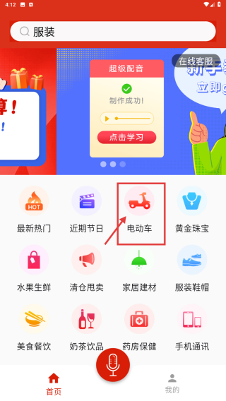 1、打开配音类应用,点击电动车分类选项,进入电动车配音模板列表页。
