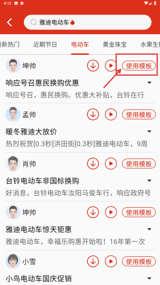 2、在模板列表中,选择目标配音模板如坤帅的电动车促销模板,点击使用模板进入配音制作页。
