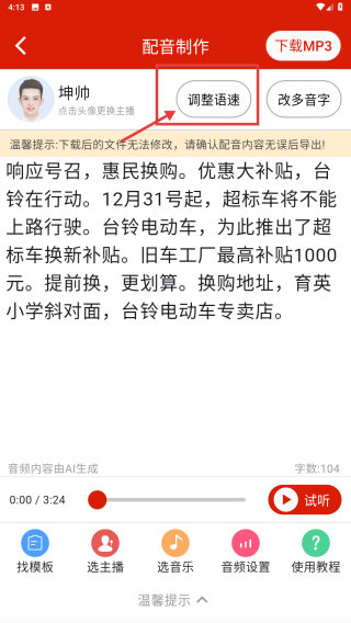 3、在配音制作页,点击调整语速功能,进入语速调节界面。