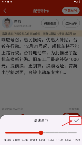 4、在语速调节界面,设置合适语速后点击确认图标,完成语速设置。