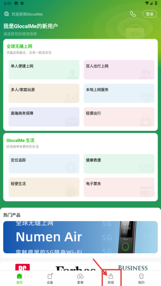 1、打开全球上网服务应用,点击底部商城选项,进入商城页面。