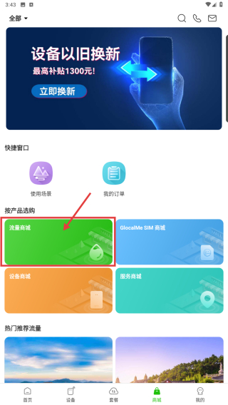 2、在商城页面,选择流量商城入口,进入流量包选购界面。