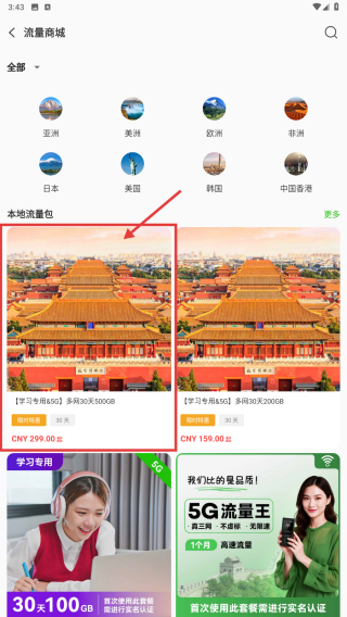 3、在流量包选购界面,浏览本地流量包列表,选择学习专用流量包。