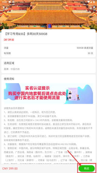 4、在流量包详情页,点击购买按钮,完成流量包购买操作。