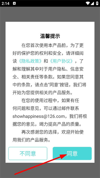 1、在温馨提示弹窗中,点击同意,进入APP主界面。