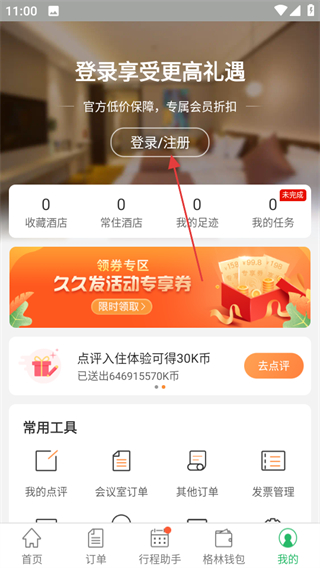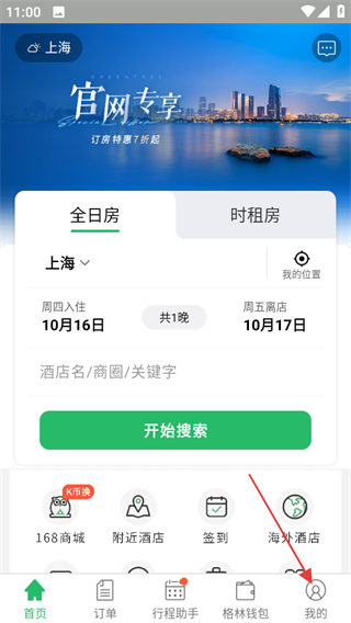 1、进入格林酒店首页,点击底部我的,进入个人页面。