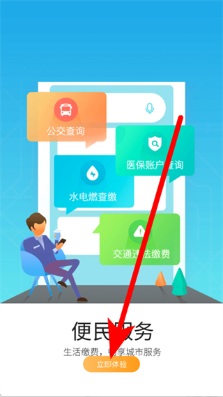1、打开吕梁通,点击界面中间的立即体验按钮,进入应用主界面。