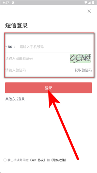 5、收到短信验证码后将其填入对应输入框,勾选后,点击登录,完成注册操作。