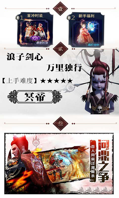3、众多的漫画人物再次触发了你浪子的情节,万人争霸实现百舸争流。游戏完美还原了原作中的人物性格和关系,同时加入了创新的社交玩法,让玩家可以组建帮派,参与跨服大战,体验真正的江湖争霸。