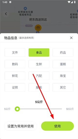 3、在物品信息页面,选择要寄送的物品类型,点击使用按钮。