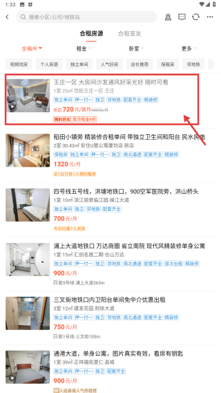3、在房源列表中,点击目标房源如王庄一区大房间沙发通风好采光好随时可看,进入房源详情页。