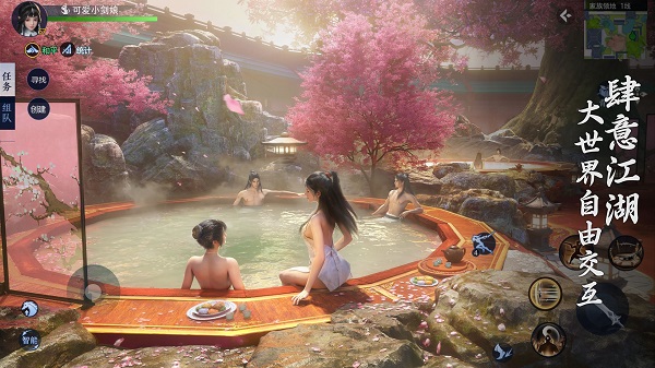 游戏打造了一个高度自由的武侠大世界,玩家可以通过独创的御雕高空飞行系统俯瞰江湖美景,也能施展轻功飞檐走壁。世界各处都设置了丰富的互动元素,包括宴席、弹琴、泡温泉、划船、潜水、挖宝等数十种趣味玩法。特别设计的双人交互系统和水陆空三栖坐骑,让玩家能够与好友共同探索这个无拘无束的武侠世界。