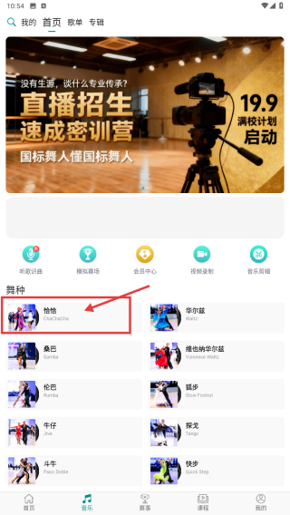 2、在音乐页面,点击恰恰舞种分类,查看恰恰舞相关音乐。