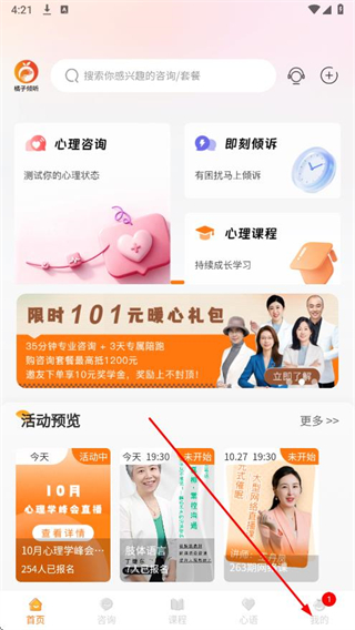 1、打开橘子倾听app,点击底部导航栏中的我的选项。