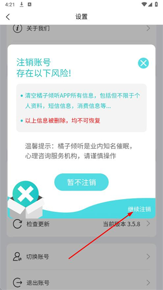 4、在弹出的注销账号存在以下风险提示框中,点击继续注销按钮。